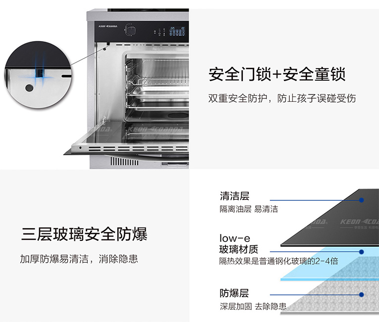 同時集成灶十大品牌、廚電行業(yè)十大品牌科恩蒸烤消一體集成灶蒸菜時也不會出現(xiàn)冷凝水滴落的現(xiàn)象,配備了蒸汽后排技術(shù),蒸汽隨著風(fēng)機(jī)自動排出,菜與菜之間不會串味,這樣出來的菜品也就色香味俱全!另外箱門還有多層高溫防護(hù)技術(shù),在普遍的耐高溫鋼化玻璃基礎(chǔ)上,中間再置入一層Low-e玻璃材質(zhì),隔熱效果是普通鋼化玻璃的2-4倍,避免不小心燙傷皮膚。