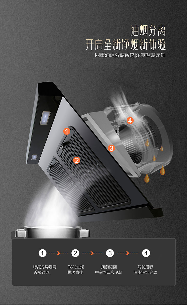 為了達(dá)到精準(zhǔn)控?zé)熜Ч?strong>科恩6520大吸力體感觸控?zé)煓C(jī)擁有900mm攏煙大寬屏,如巨幕般籠罩,快速捕獲升騰油煙,形成有效油煙封鎖帶,迅速攏煙,將油煙“收入囊中”。四重油煙分離系統(tǒng):特氟龍導(dǎo)煙網(wǎng)冷凝過(guò)濾→98%油煙攏吸直排→中空網(wǎng)二次冷凝→渦輪甩吸油脂油煙分離。將油煙一網(wǎng)打盡,還原無(wú)煙廚房助推凈煙升級(jí),開(kāi)啟全新凈煙新體驗(yàn),卡扣式隔煙屏采用特氟龍工藝技術(shù),不沾油輕松易打理。