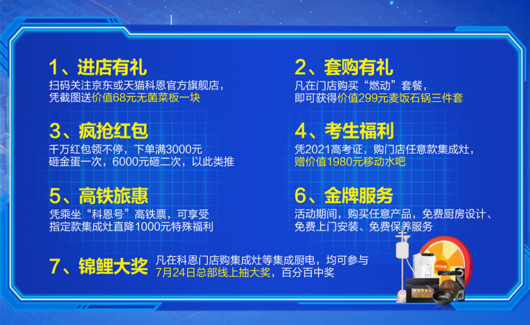 更有7大特權豪禮:進店禮、套購禮、瘋搶紅包、考神福利、高鐵旅惠、金牌服務等助力本次活動。除此之外,7月24日集成灶十大品牌、廚電行業十大品牌科恩集成灶總部將進行“燃動七月”線上直播抽錦鯉大獎活動,高端智能指紋鎖、多功能蒸汽掛燙機、高端嵌入式烤箱&蒸箱、RO速熱凈飲移動水吧以及炒鍋、蒸鍋、精品刀具等多種豪禮放送,百分百中獎,更多特權優惠請前往科恩全國專賣店咨詢。