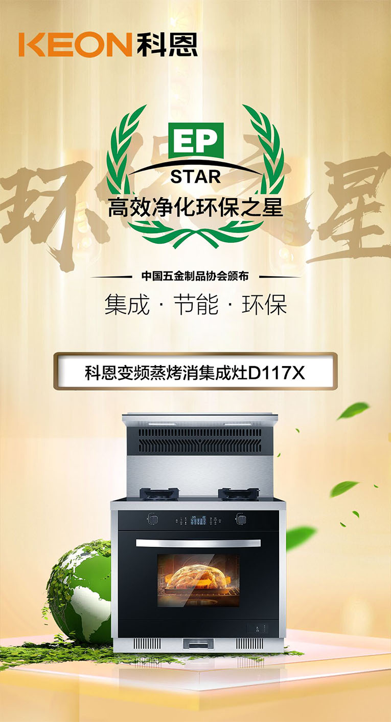 科恩D117X集成灶在眾多品牌中脫穎而出,斬獲由中國五金制品協會頒發的2020年中國集成灶“高效凈化環保之星”。