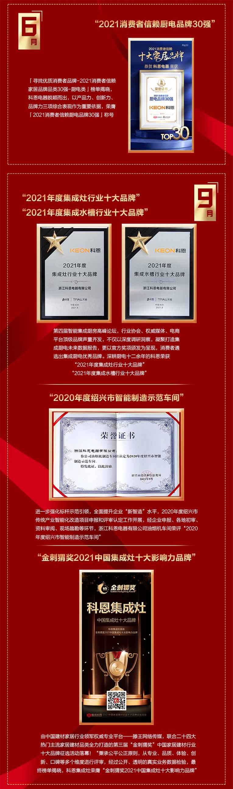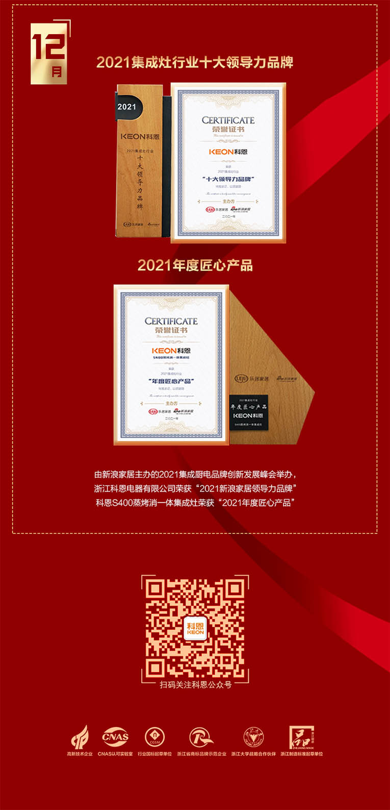 樂享智慧廚房,有著這些榮譽背書,科恩集成灶品質更值得用戶信賴,而科恩也會這些信賴轉化為動力,不斷研發、制造出更優秀的產品。