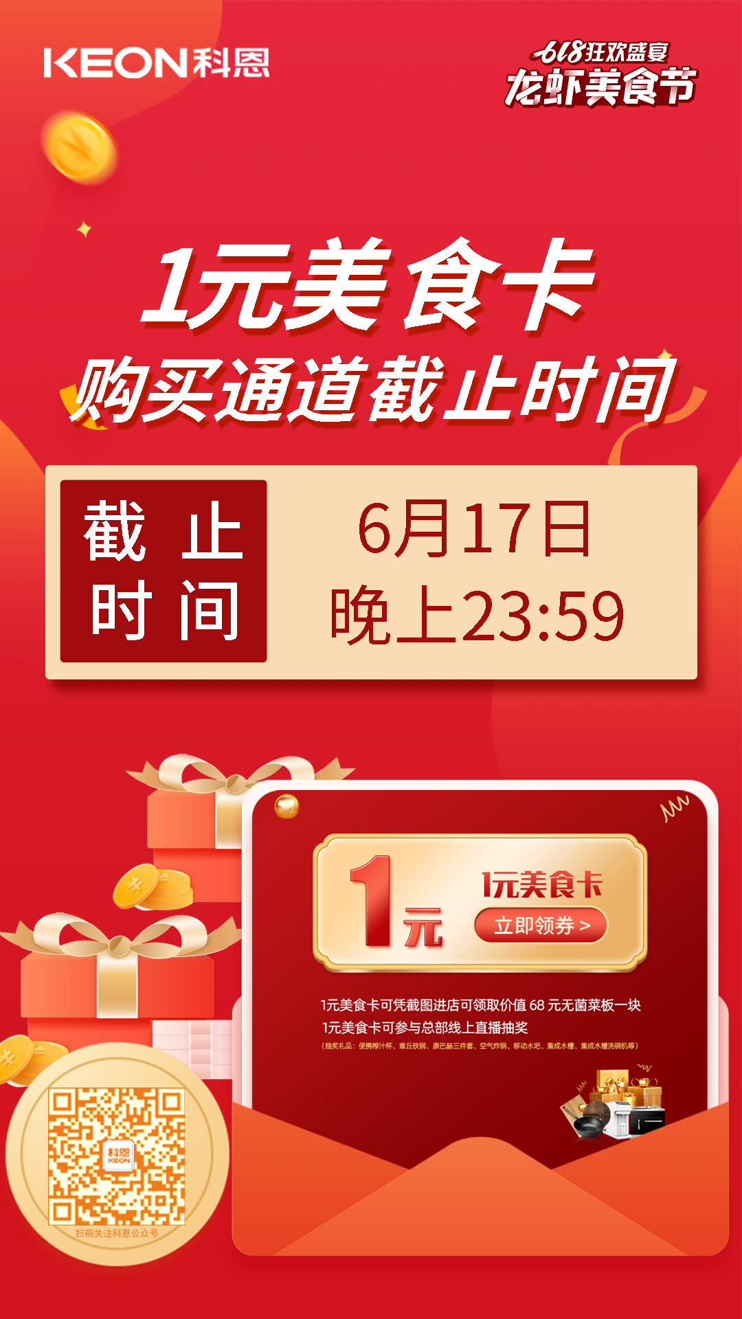 注意!注意!注意!科恩集成灶618狂歡盛宴——龍蝦美食節將于6月18日14點直播大抽獎后落下帷幕,1元美食特權專屬卡權購買通道也將于今晚(6月17日)23:59準時關閉!薅羊毛福利即將進入倒計時!還沒有購買一元特權卡的朋友們要抓緊時間了!話不多說,最后一次薅羊毛安利,拿走不謝!