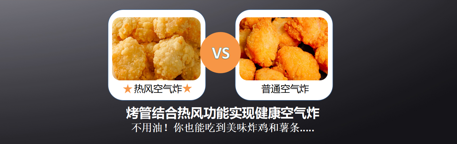 時下流行萬物皆可炸,龍蝦、烤翅、薯條、豆腐、果干、雞米花、烤腸... C260的低脂空氣炸分分鐘滿足你的炸貨需求,專業級空氣炸系統,烤管結合熱風功能,利用高速空氣循環技術,代替高溫熱油,使食物快速脫水,實現健康空氣炸,炸出鍋的美味焦香薄脆,入口鮮香爆汁,恰到好處的味道,實在是美極了!不用油,也能吃到美味炸串,不產生油煙和有害物質,無油無慮,盡管放肆開吃!