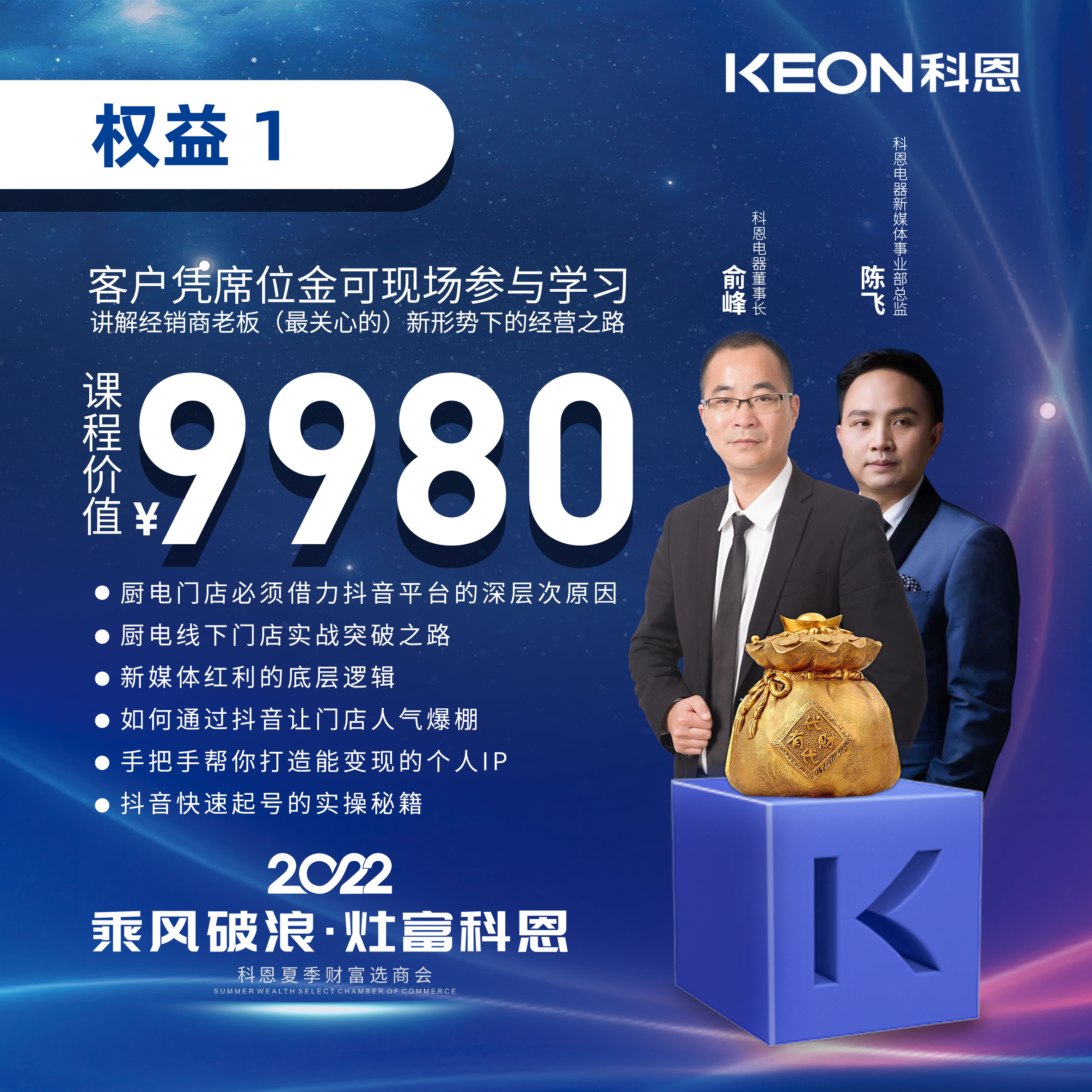 權益一、客戶憑席位金可現場參與學習時下經銷商老板最為關心的新形勢下的經營之路,科恩電器董事長攜新媒體事業中心團隊親身入局,創新立意開辟抖音引流變現的新賽道新玩法,手把手幫你打造能變現的個人IP,助力經銷商在新零售市場前景下,輕松實現彎道超車。