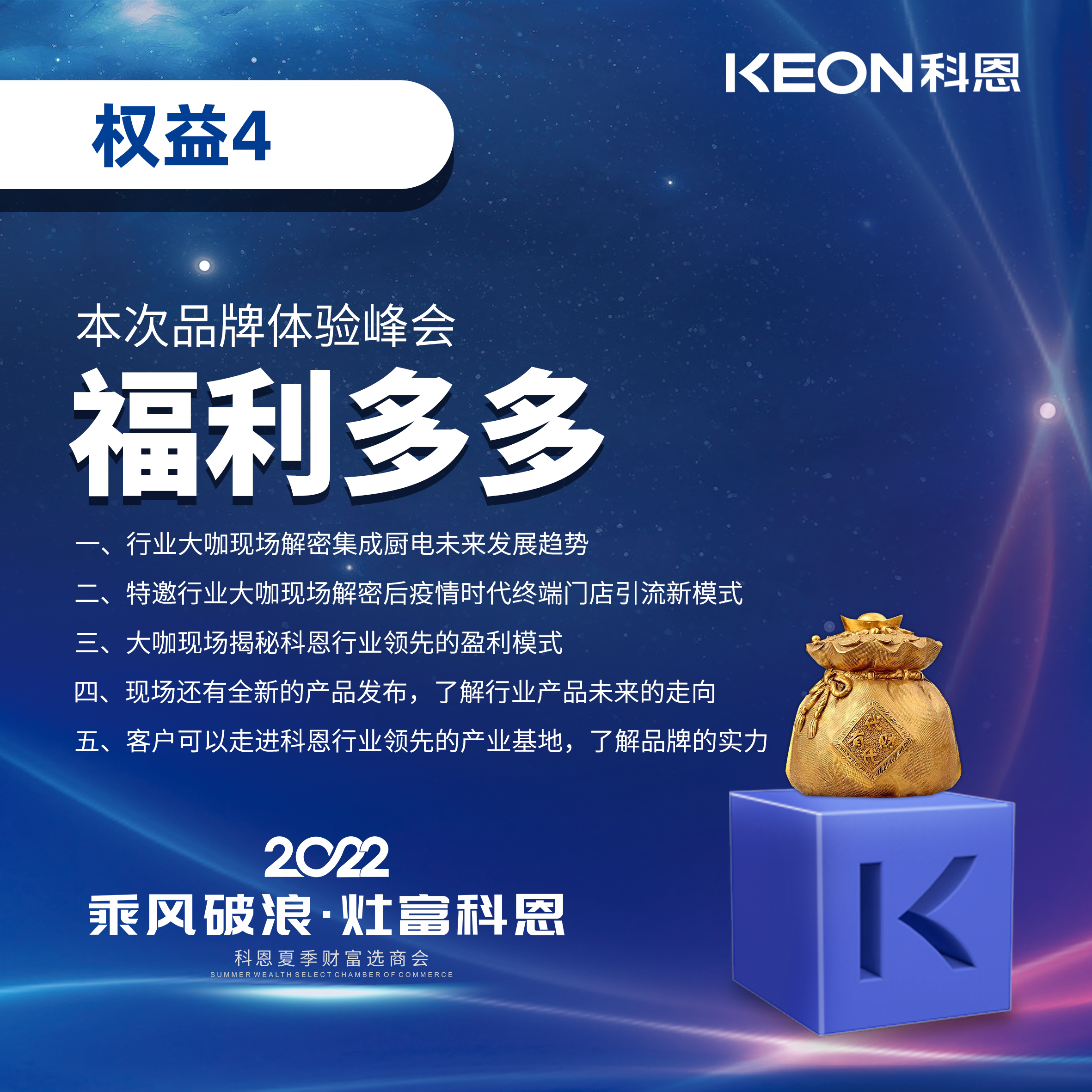 【乘風破浪·灶富科恩】——2022科恩夏季財富選商會將于7月27日在廚具之都嵊州隆重開啟,屆時將廣邀廚電行業資深大咖、業界菁英齊聚一堂,共同探討廚電行業發展之路的機遇和挑戰,開創行業新賽道,更有專屬六大特權,把握機會,緊握財富之手,六大權益,共享巨擘商機,趁現在,贏未來!