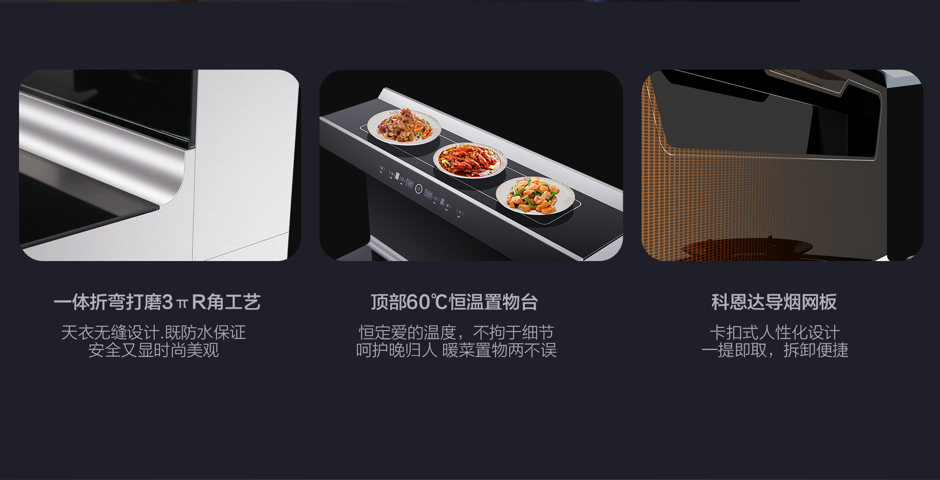 ◆黑晶防爆玻璃臺面,具備具備高性能防爆特性;機頭與機身結合處采用一體折彎打磨3πR角工藝——天衣無縫設計,既能防水保證安全、打理便捷又顯得時尚美觀;再加上一提即取的科恩達導煙網板,分分鐘實現輕松拆卸,使得內部清潔打理成為舉手之勞!