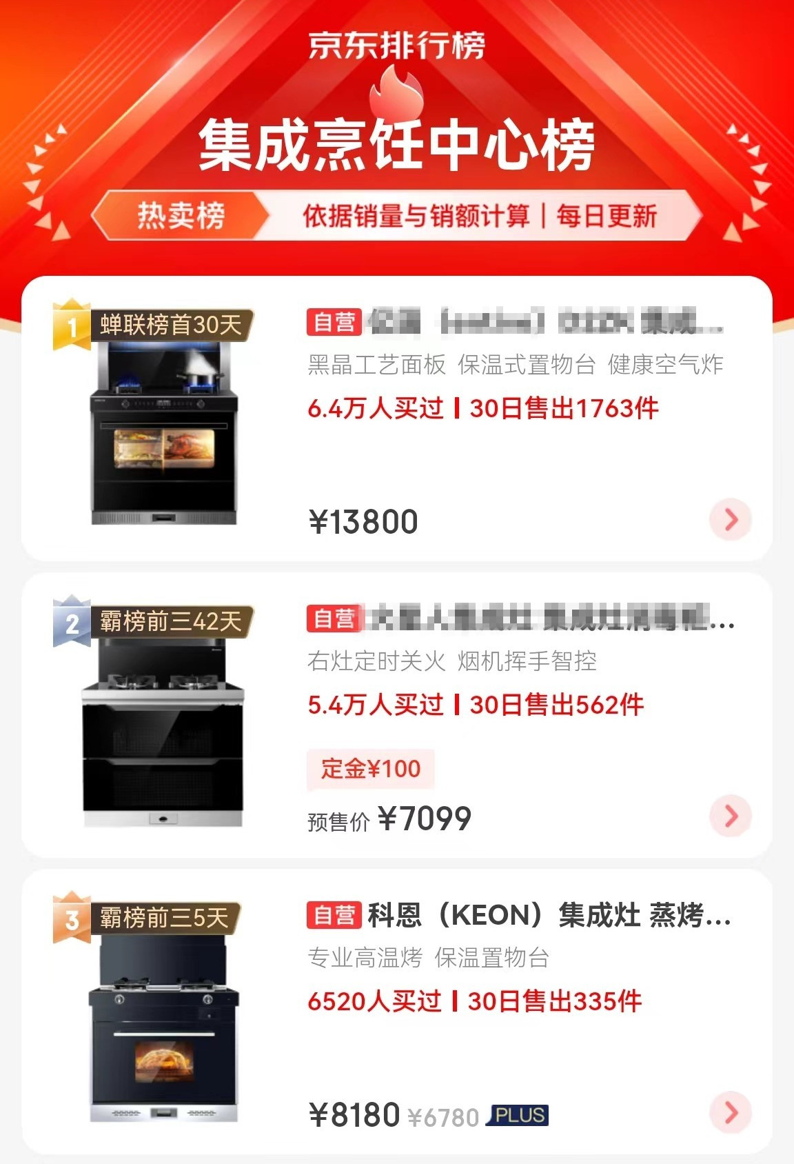 豪橫!科恩集成灶霸榜京東集成烹飪中心榜前三!
