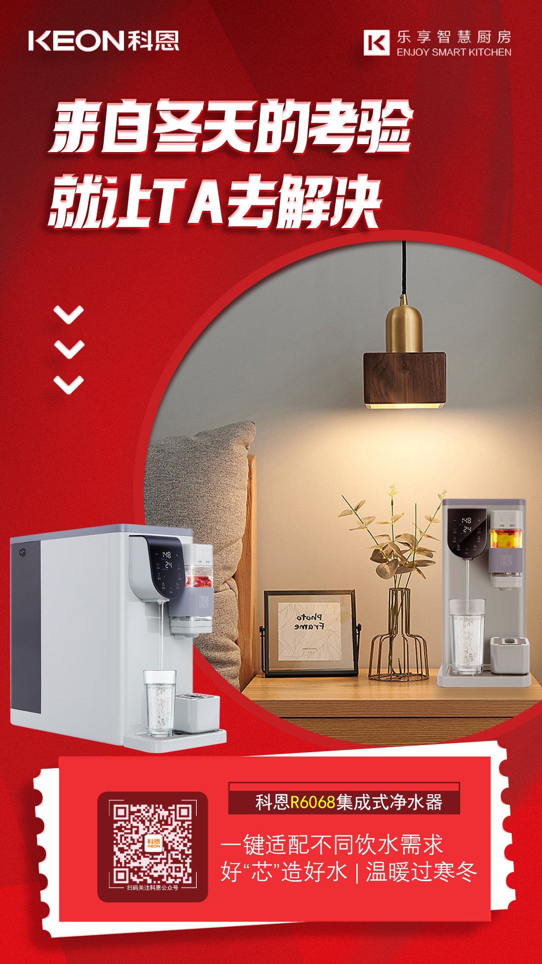 科恩集成式凈水器,RO精濾,UV殺菌,集凈飲加熱于一體,采用即熱和智能溫控技術(shù),實現(xiàn)快速制熱,無極控溫,水量可調(diào),滿足不同人群的用水需求,無論是老爸的一壺茶、親友的咖啡、果茶、寶寶的沖奶水,一應(yīng)俱全,讓全家人在這個冬天隨時喝上安全健康水,暖胃更暖心。
