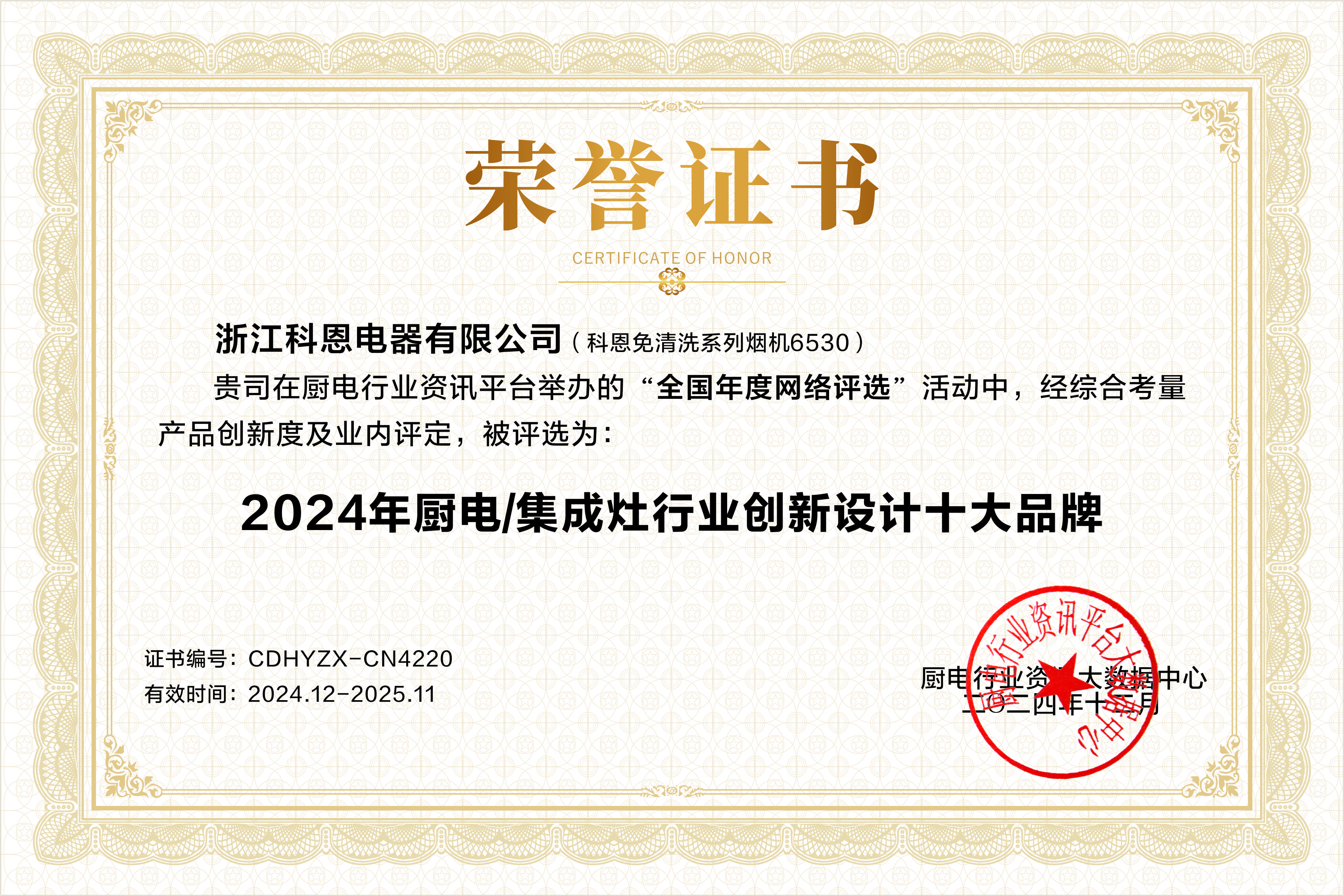 在剛剛過去的2024年,科恩電器更是榮譽(yù)加身,榮獲了“2024年廚電行業(yè)影響力十大品牌、消費(fèi)者好口碑十大品牌、廚電/集成灶創(chuàng)新設(shè)計(jì)十大品牌等稱號”。這些殊榮不僅是對科恩電器過去一年在產(chǎn)品研發(fā)、品牌建設(shè)、市場推廣以及客戶服務(wù)等方面所付出努力的高度肯定,更是為其在激烈的市場競爭中贏得了更多的話語權(quán)和競爭優(yōu)勢。