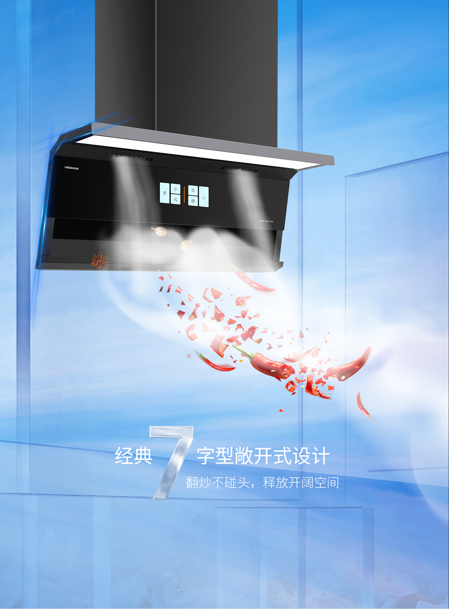定義空間優雅美學,2.5cm超薄機身+7字型敞開式,顛覆傳統煙機厚重印象。0.1立方敞開式大空間,翻炒再也不用擔心碰頭煩惱,帶你沉浸式體驗烹飪樂趣!模塊化觸控鍵流轉金屬光澤,指尖輕點即響應,更有揮手智控模式。讓油膩指紋告別煙機表面在煙火里感受從容自由