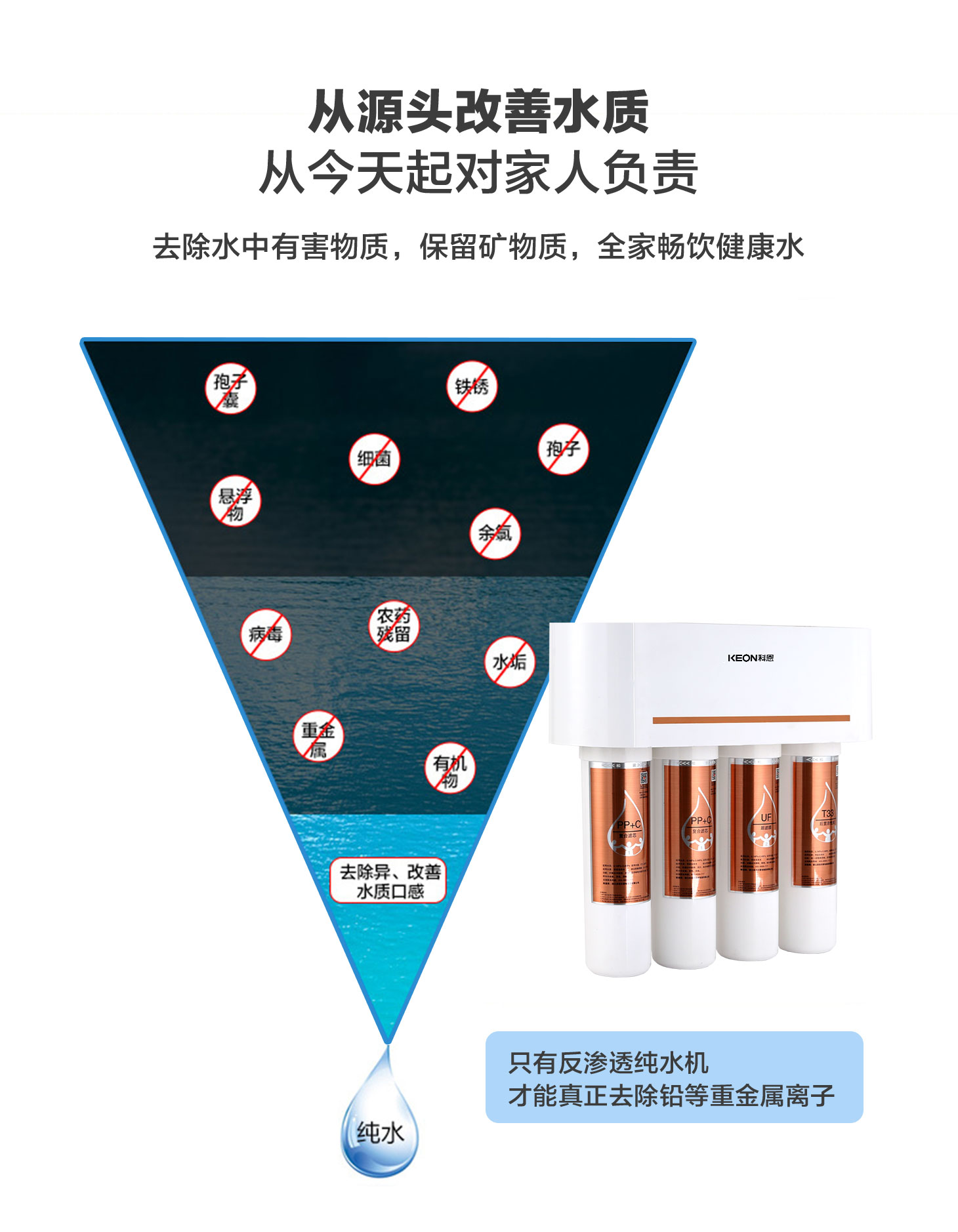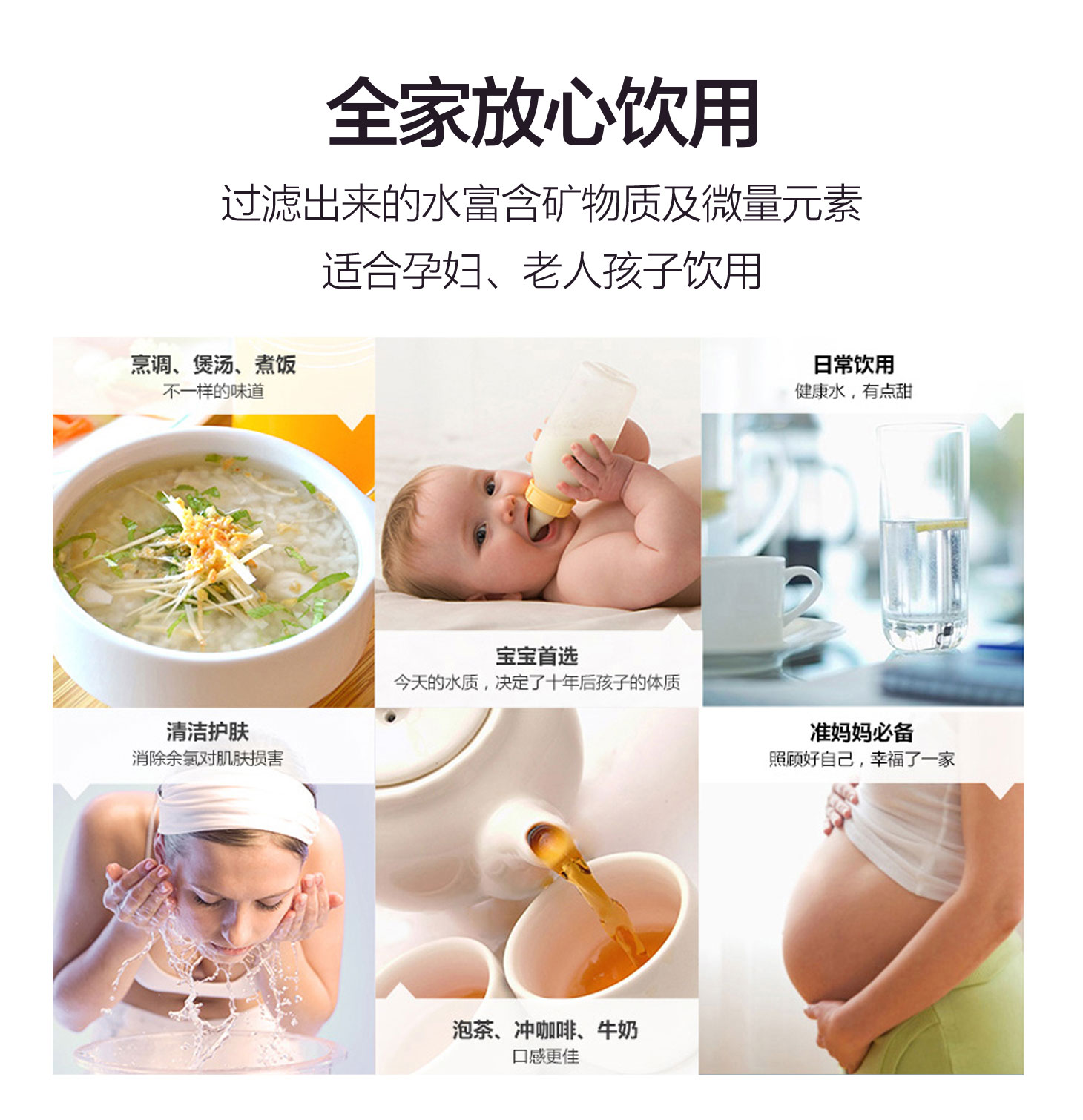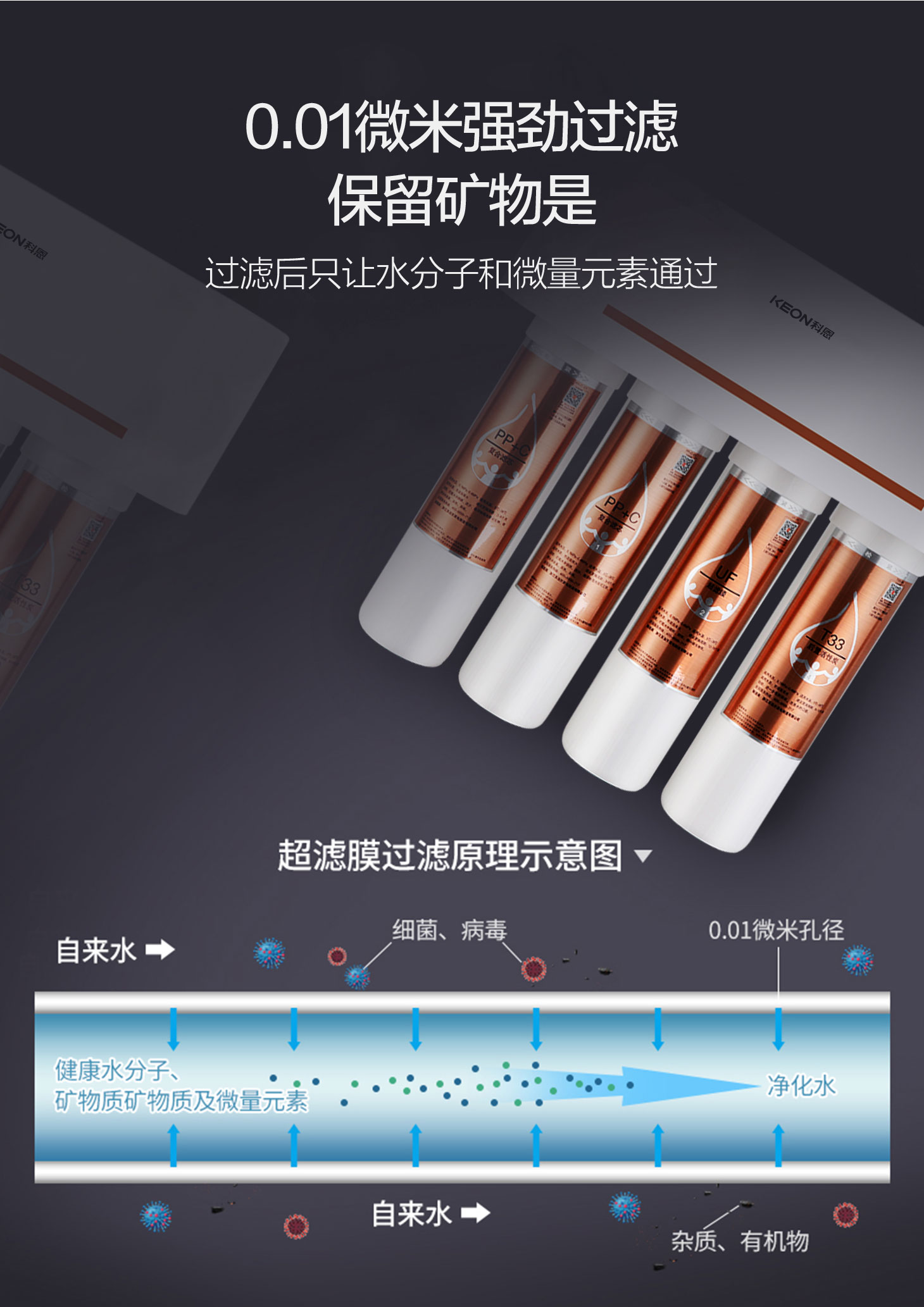 - 四重五級(jí)過(guò)濾,0.01微米超濾膜去除細(xì)菌和病毒。