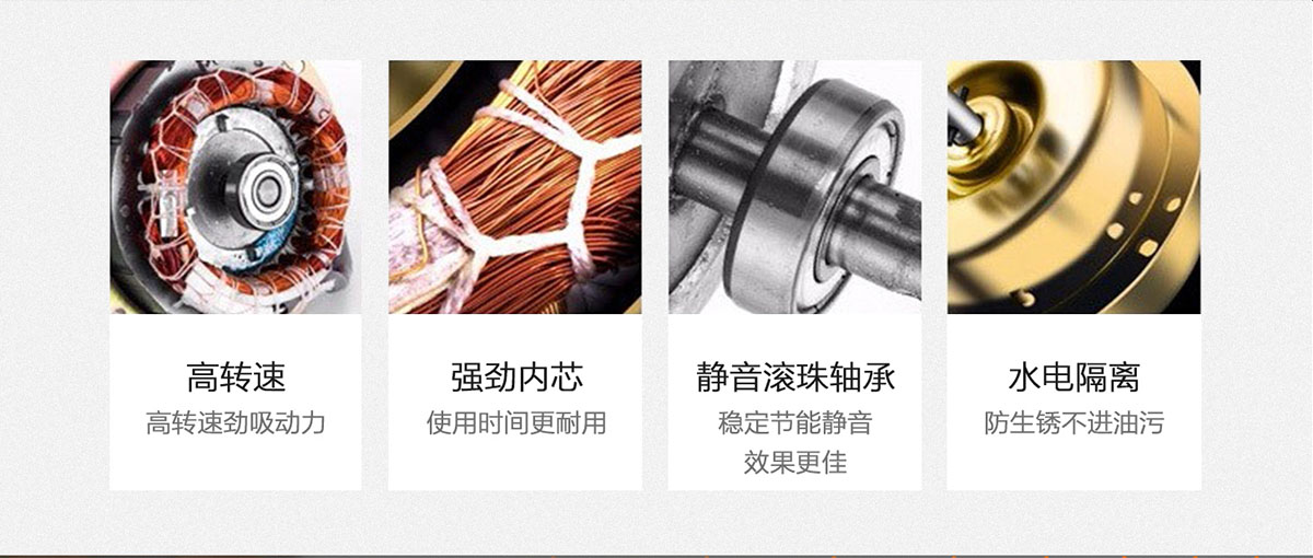 - 全封閉雙滾珠靜音電機,高速運轉不顛簸,高效耐用,防銹耐污。