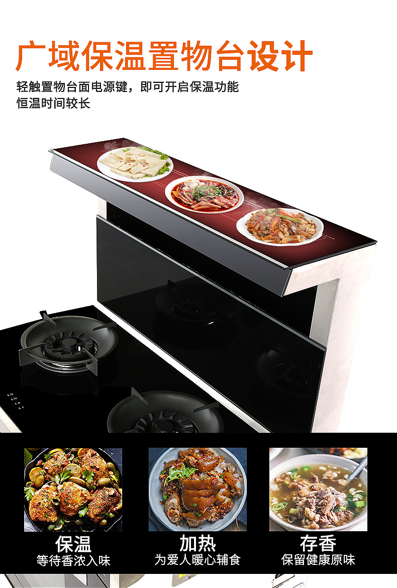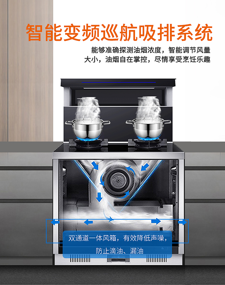 • 智能巡航吸排系統,準確探測油煙濃度,智能調節風量大小。