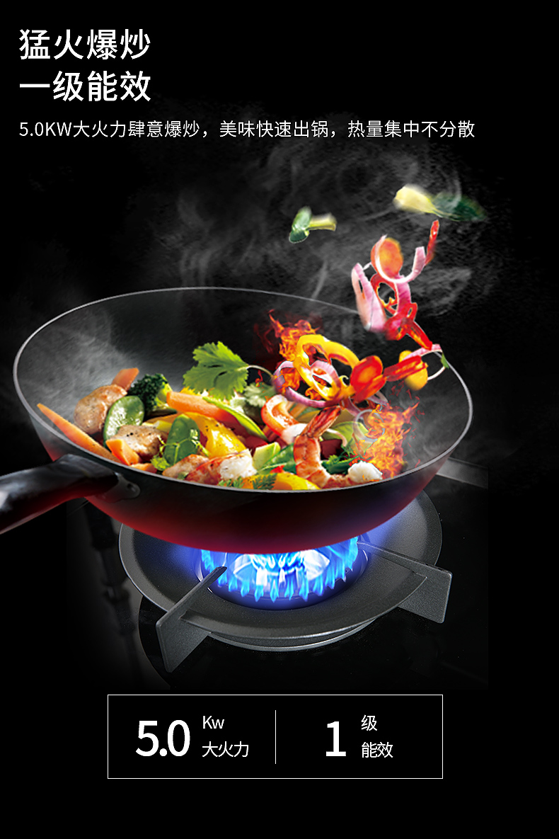 • 精控勁火,1級能效,5.0KW大火力肆意爆炒,美味快速出鍋。