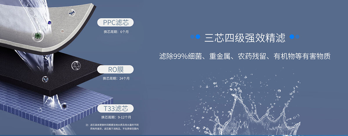 • 三芯四級(jí)強(qiáng)效精濾,濾除99%細(xì)菌重金屬