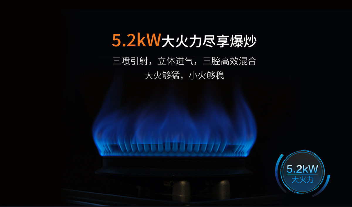 - 三噴引射,立體進(jìn)氣,5.2kW大火力盡享爆炒